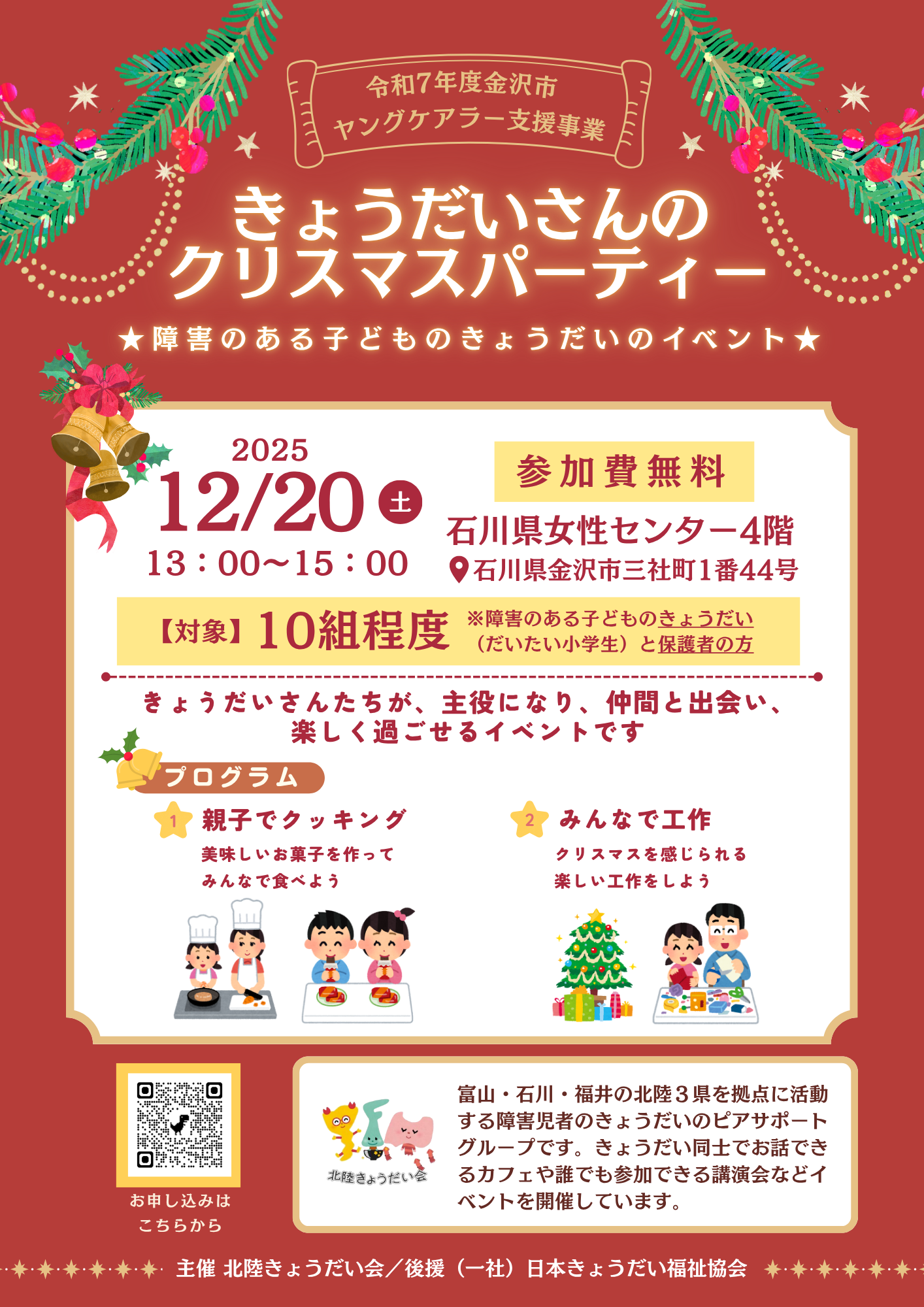 きょうだいさんたちが主役になり、仲間と出会い、楽しく過ごせるイベントを開催します。親子で一緒にクッキングをしたり、みんなでクリスマスにちなんだ工作などを行う予定です。